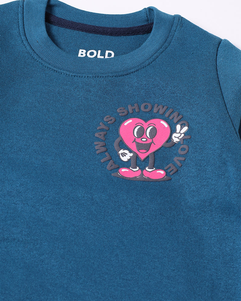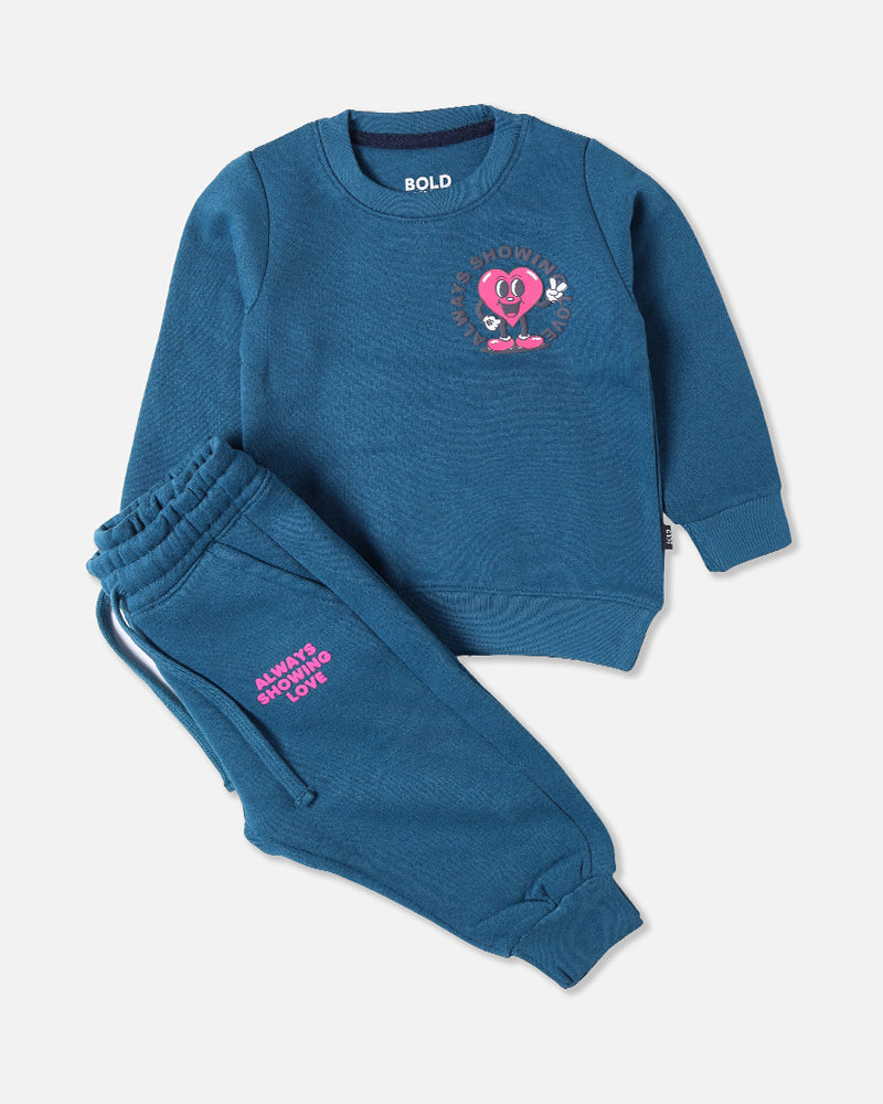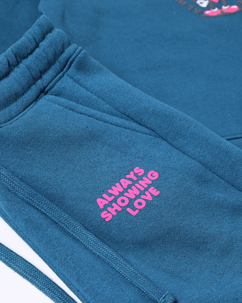 Girls Always Showing Love Printed Teal Track Suit